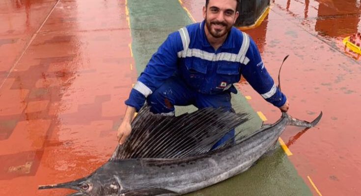 Τropaio: Ο Γιώργος Φλεβάρης εκτός από καπετάνιος είναι και μαέστρος στο ψάρεμα. Ψάρεψε στον ινδικό ωκεανό έναν ξιφία που ζυγίζει όπως βλέπετε και στη φωτογραφία 42 κιλά, τον εγκλώβισε με αγκίστρι. Το ανέβασμα στο πλοίο χρησιμοποίησαν αναβατήρα. Μπράβο καπεταν Γιώργο!
