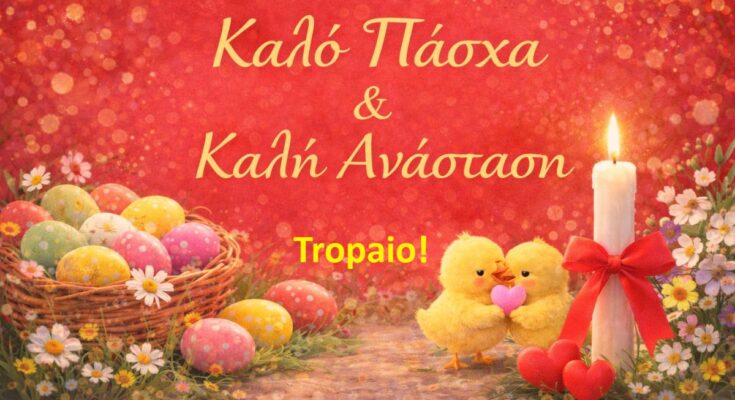 Το Τropaio και η εθελοντική ομάδα του σας εύχεται καλό Πάσχα, καλή ανάσταση, και ιδιαίτερα στους αναγνώστες του . Η πορεία του Θεανθρώπου από τη Σταύρωση στην Ανάσταση είναι ο δρόμος που όλοι μας καλούμαστε να ακολουθήσουμε στη ζωή για να ανακαλύψουμε το πραγματικό νόημά της.